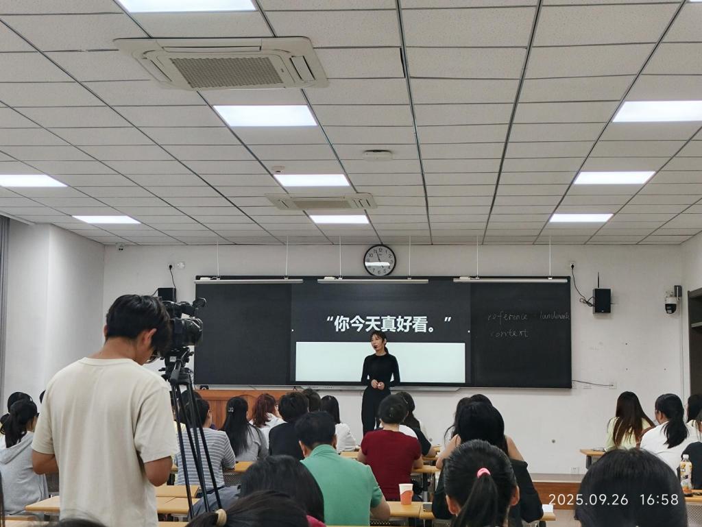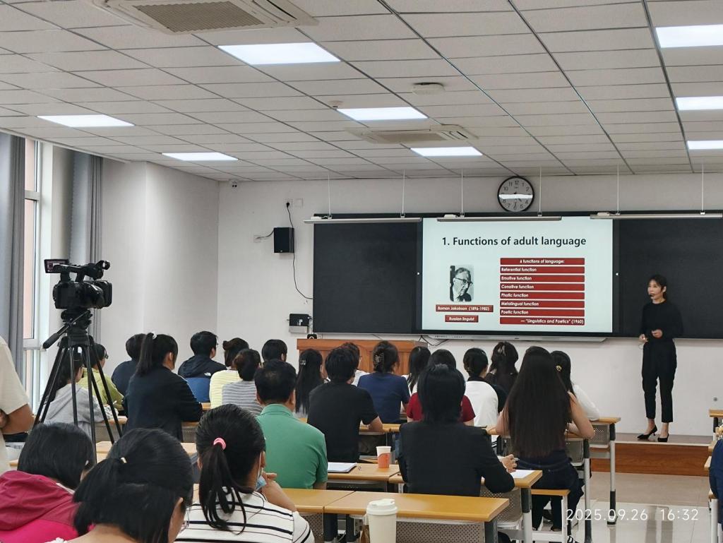 2025年9月26日下午,王莹老师在知行楼B214讲授《英语语言学》课程。本次观摩课聚焦《英语语言学》“语言的功能”主题,围绕Jakobson 六大功能与 Halliday 七大功能展开。课程以产出导向为牵引,落实目标—活动—评价对齐:先通过显性讲解明确功能定义、典型语言信号与判别思路,再提供步骤清单与句型框架等显性支架,组织学生完成“在具体语句/语境中判定主、次功能并给出证据”的小组任务。课堂材料涵盖日常表达、广告语等真实文本,学生在讨论、互评与量规反馈中形成证据意识与学术表达能力。课程同时强调价值引领,鼓励学生以批判性视角辨析媒体与公共表达,在合作交流中提升规则意识、社会责任与团队协作素养。