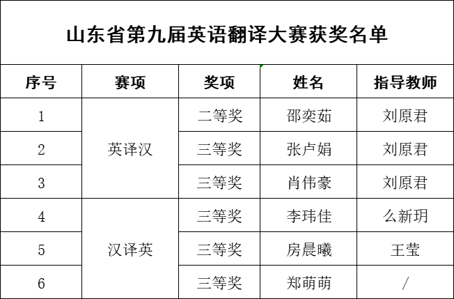 11月初,山东省第九届英语翻译大赛圆满落幕。本次大赛为英语笔译大赛,分汉译英组和英译汉组,大赛获奖奖项按照两组分别评定。我校在参赛成绩与赛事组织上双双收获硕果,英译汉组荣获二等奖1项、三等奖2项、优秀奖9项,汉译英组荣获三等奖3项,优秀奖9项,学校被授予大赛“优秀组织奖”。选手们凭借扎实的翻译功底与卓越的语言能力,充分展现了当代大学生融通中外的时代风采。