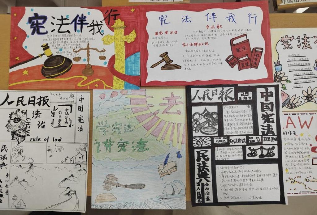 活动开始后,负责人围绕“宪法伴我行”“弘扬宪法精神”等主题,向参与同学讲解活动内容及相关注意事项,随后组织同学们以制作手抄报的形式学习宪法知识。创作过程中,同学们将自身对宪法的理解融入绘画与文字创作中,现场秩序井然。手抄报制作完成后,负责人对作品进行收集整理,统一摆放展示并拍摄记录。此次活动让同学们对宪法精神形成了更为深刻的认知,也推动了法治理念在校园中的进一步传播。