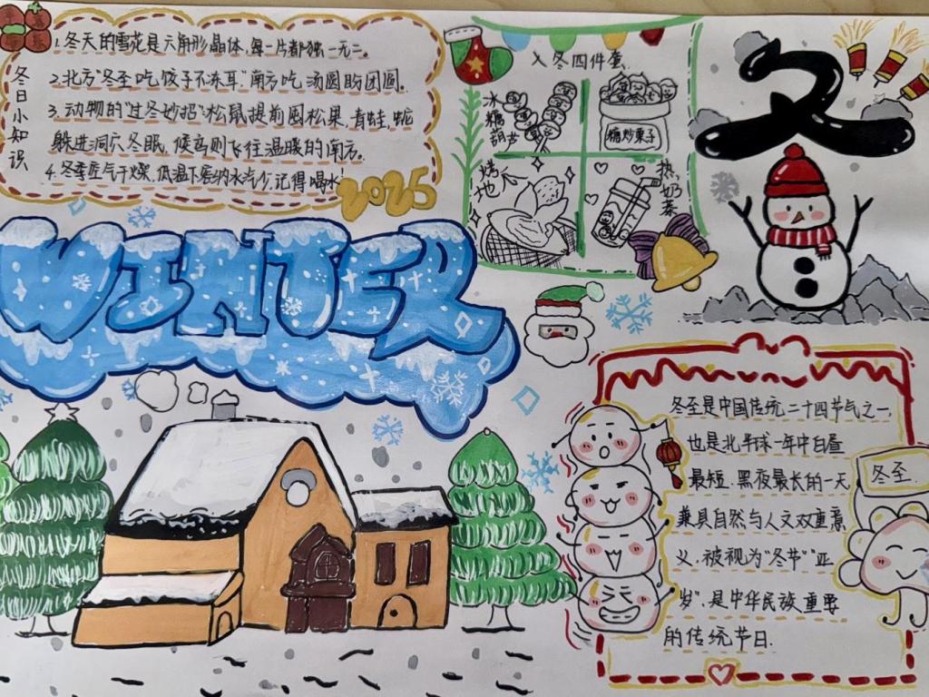 活动开始前,负责人明确创作主题要求,敲定参与人员与活动时间。随后,活动正式开始,同学们执笔勾勒、巧思排版,将冬日美景与文艺情思凝于手抄报之上。大家精心设计版面,以冬日雪景、民俗等元素为创作核心,有的用细腻笔触描绘雪落枝头的诗意,有的以创意构图呈现围炉赏雪的温馨。经过评选,2025级英语本科班甘甜等两名同学获得一等奖;2025级商务英语专升本班姜良婕等四名同学获得二等奖;2024商务英语专升本班穆申奥等六名同学获得三等奖。